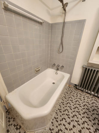 • Ceramic tile bath w/full-size tub, vanity, mirror & designer lighting